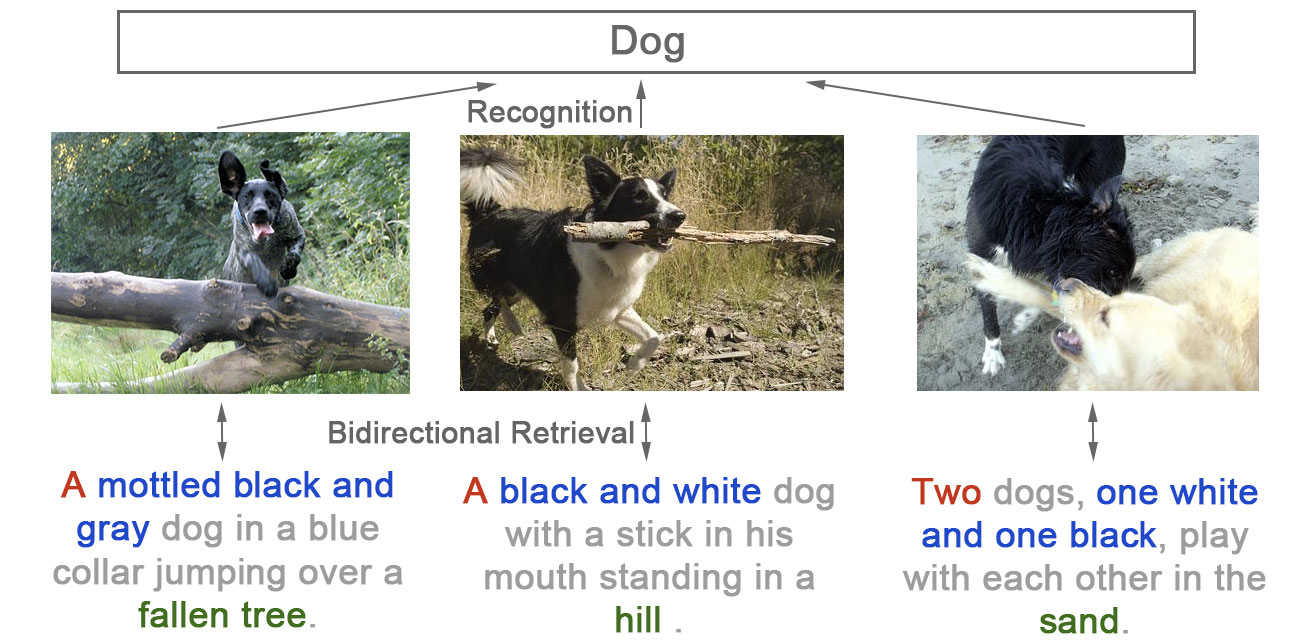 - 同时我们又观察到好多之前的工作都直接使用 class-level的 ImageNet pretrained 网络。但这些网络实际上损失了信息(数量/颜色/位置)。以下三张图在imagenet中可能都会使用Dog的标签,而事实上我们可以用自然语言给出更精准的描述。也就是我们这篇论文所要解决的问题(instance-level的图文互搜)。