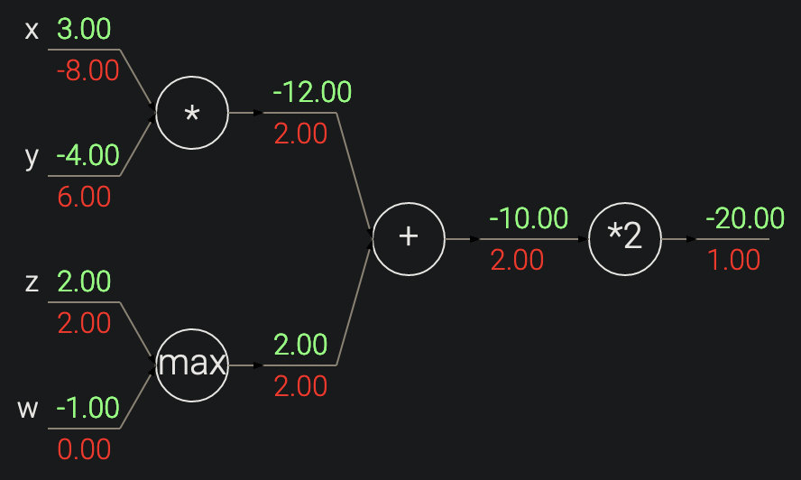 - 梯度在分叉处相加。注意多变量要用 += 累积每个分支上的梯度。即如果一个变量分支到电路的不同部分,那么流回它的梯度将会相加。