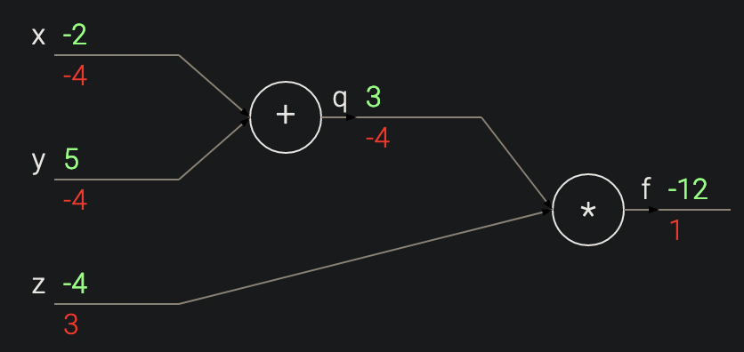 复合函数,拆成 q = x + y, f = qz,求导链式法则: