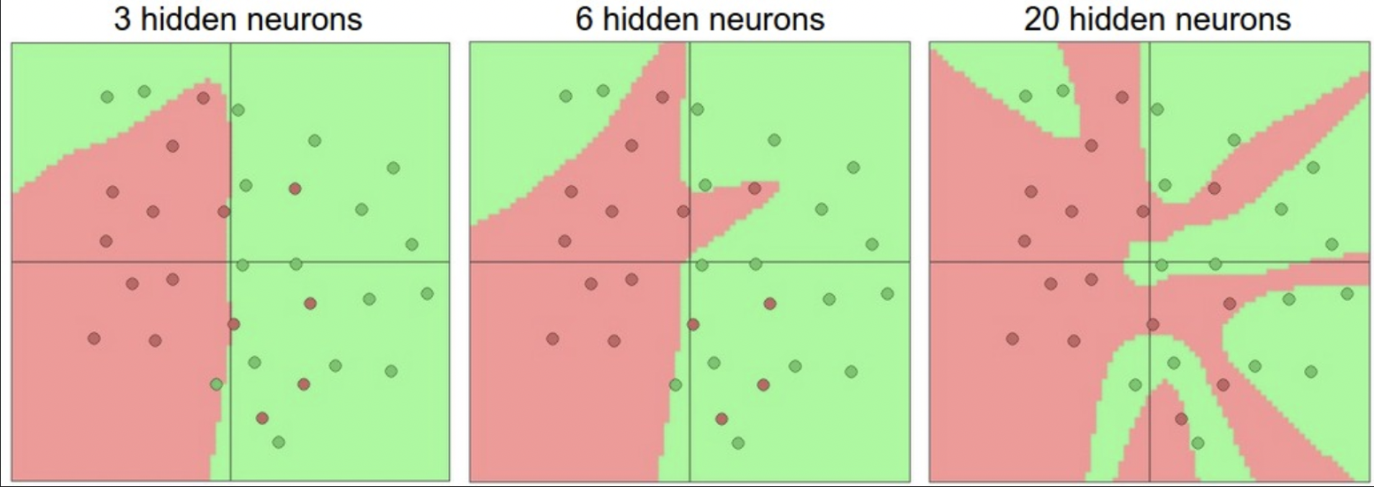 - 例如图中 20 个神经元,拟合了所有训练数据,但代价是把向量空间分成了很多不联合的区域。3 个神经元的表达能力只够大概分一下,把类外的数据解释为噪声,这在测试集中有更好的泛化。