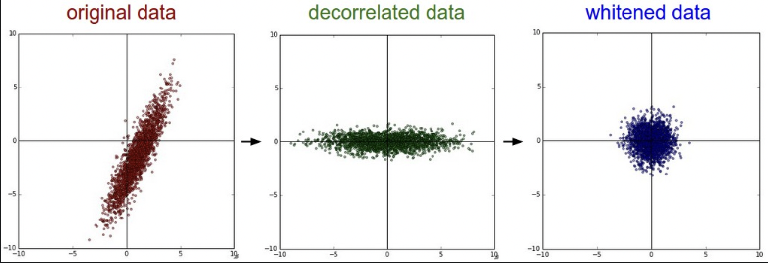 如果输入数据是高斯分布,由白化归一化为均值 0,方差 1.会夸大噪声。# whiten the data: # divide by the eigenvalues (which are square roots of the singular values) Xwhite = Xrot / np.sqrt(S + 1e-5)- PCA 后,数据 0 中心,旋转到协方差矩阵的特征基。使数据去相关,即协方差为对角矩阵。