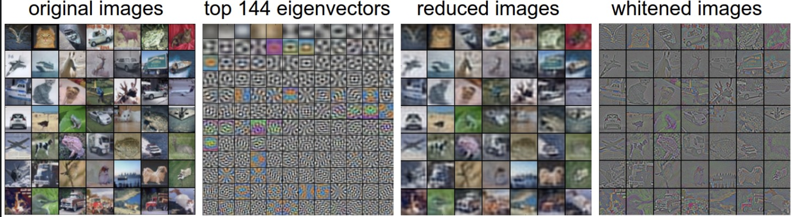 [N x D] –> [N x 100] 保留了含最大方差的 100 维数据。在 PCA 降维后的数据上训练,节省空间时间。# Assume input data matrix X of size [N x D] X -= np.mean(X, axis = 0) # zero-center the data (important) cov = np.dot(X.T, X) / X.shape[0] # get the data covariance matrix U,S,V = np.linalg.svd(cov) Xrot = np.dot(X, U) # decorrelate the data Xrot_reduced = np.dot(X, U[:,:100]) # Xrot_reduced becomes [N x 100] PCAwhitening