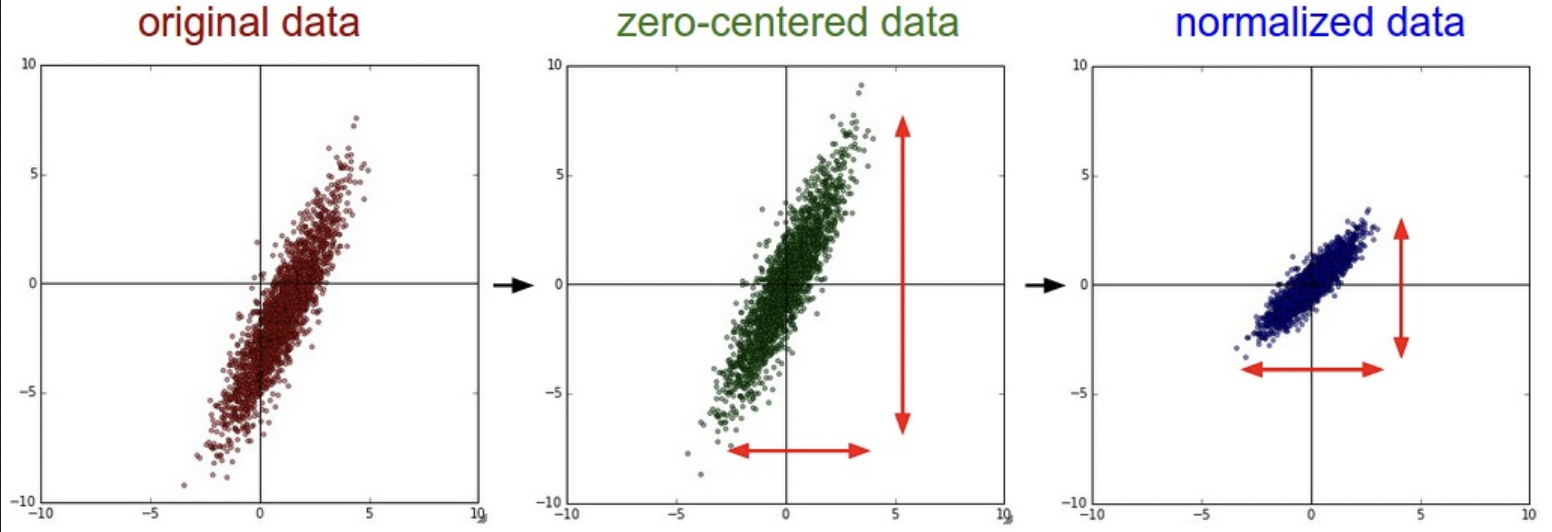 - 必要预处理:减去平均值, 0 中心化。可选:除以标准差,归一化到 [-1, 1]。归一化:希望该分布方差为 1,让每个数据除以标准差。