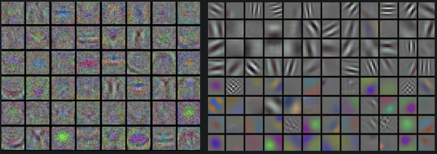 - 右:清楚的特征,训练很好。