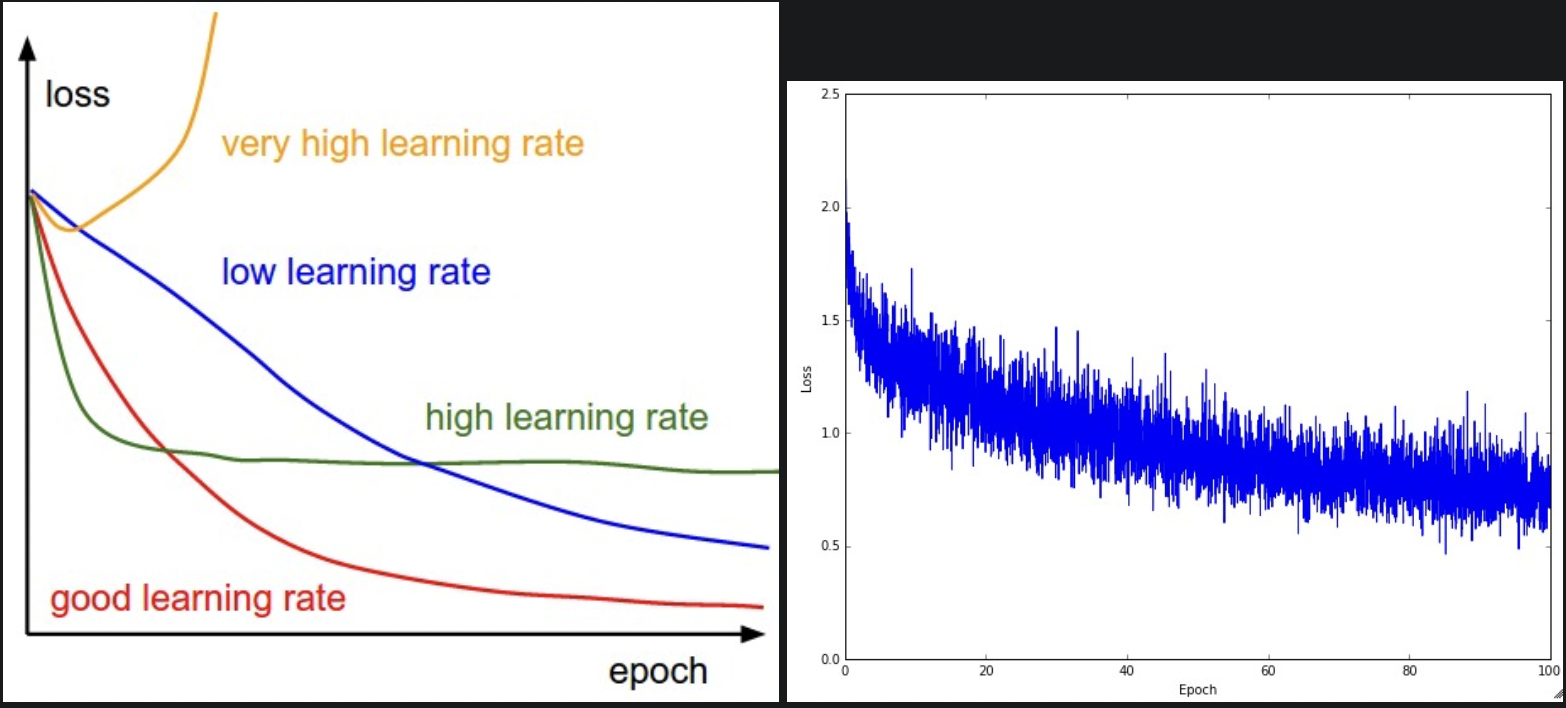- 右图:看似合理的学习率,(但衰减速度有点慢,可能学习率小了,且 batch size 小了,因为噪声较多,震荡较大。)\