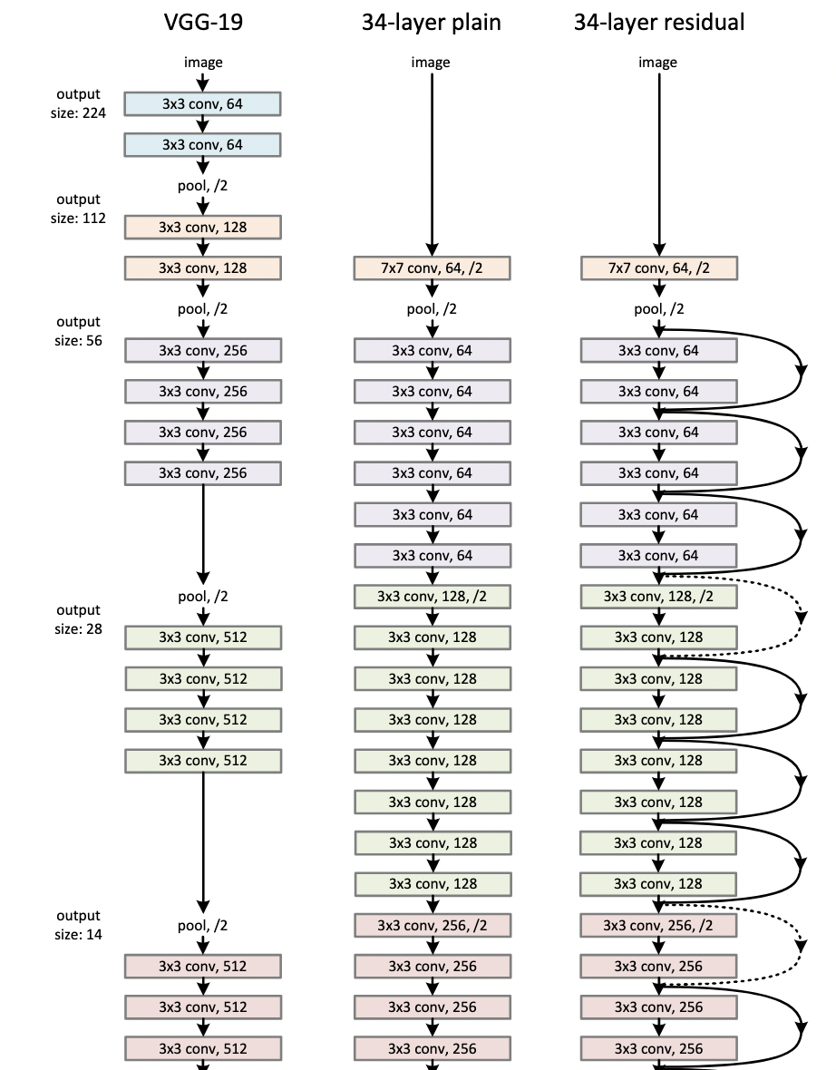 - 34 层版本一个残差块里有两个卷积层,通道维度翻倍时,空间维度除以二。