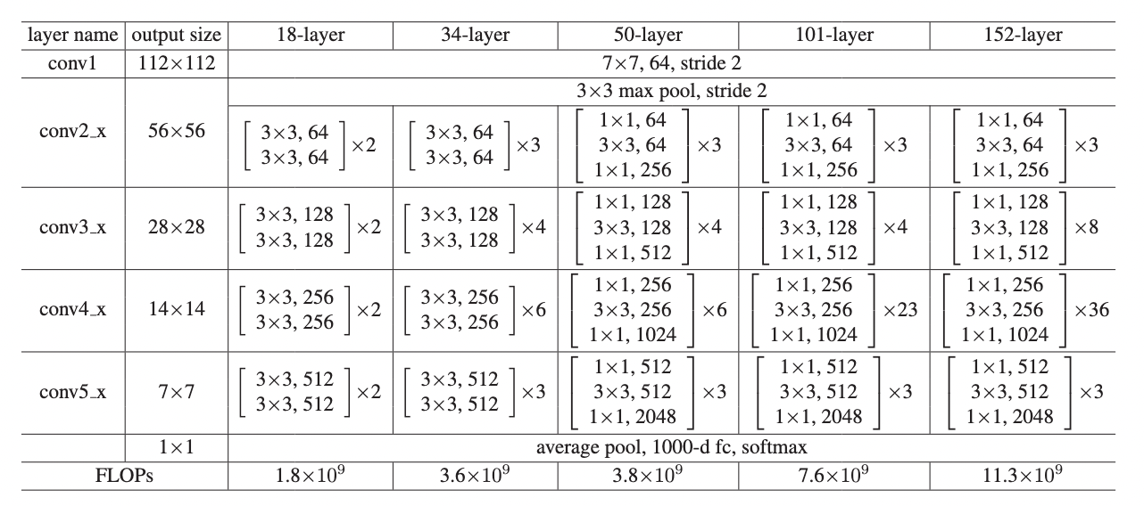 - FLOPs:整个网络要计算多少个浮点数运算。卷积层的浮点运算等价于,输入的高乘宽,乘通道数,乘输出通道数,乘和的窗口的高和宽,全连接再一层。18-34翻倍,但50层架构做了改变,计算量没变。