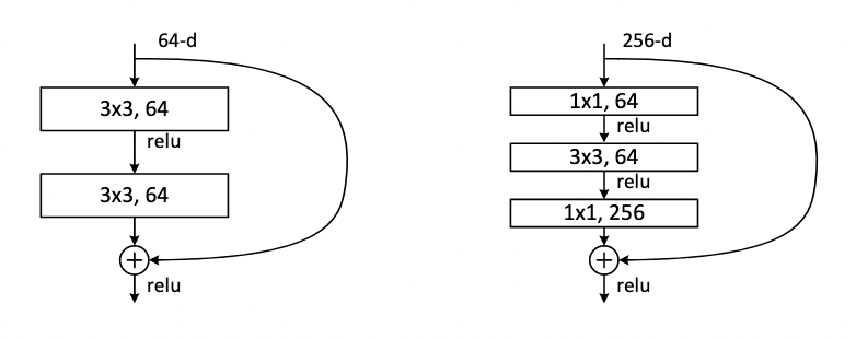 - 瓶颈:如果要做到比较深,输入维度会比较大一点,因为很深的时候可以学到更多模式,把通道数变更大 256,计算复杂度增加是平方关系,太贵了。做法:通过 1x1 卷积,把输入维度 256 映射投影回 64,中间和原来等价,最后再投影回 256。即先对特征维度降一次维,在降维上做一个空间的东西,最后投影回去,理论计算复杂度差不多。