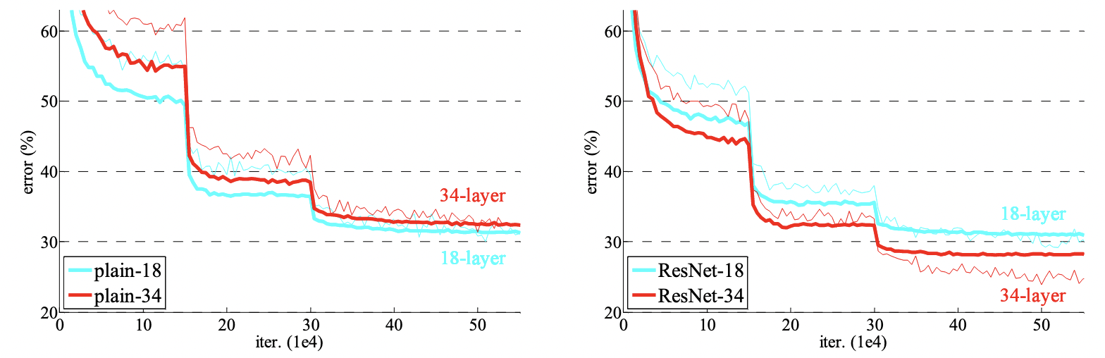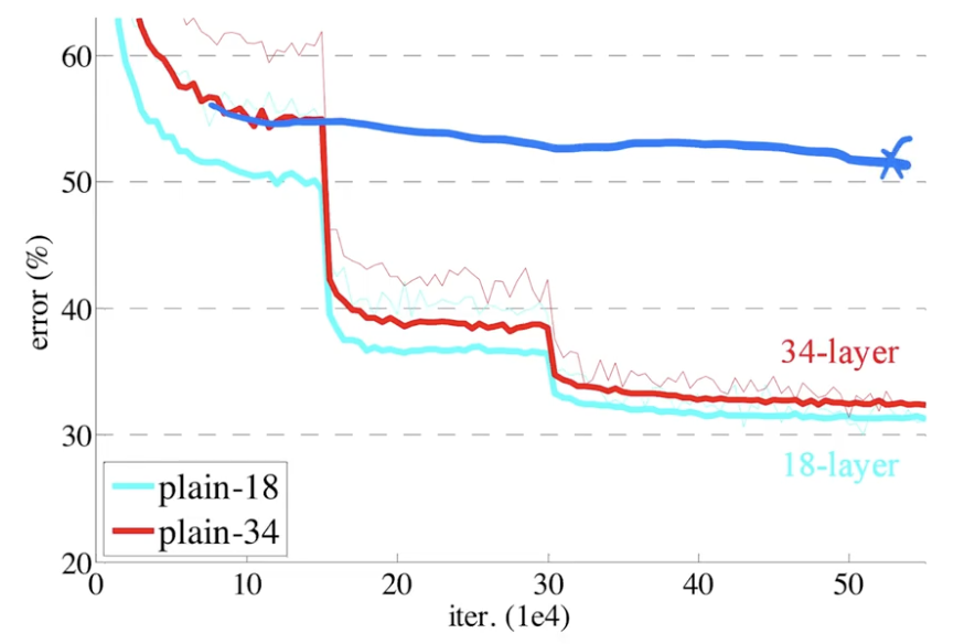 plain。x 轴是迭代次数,y 轴错误率。 - 更深的网络误差率反而更高。表明在更深的网络上是训练不动的,不仅是过拟合,更多是训练误差都不能达到很好效果。