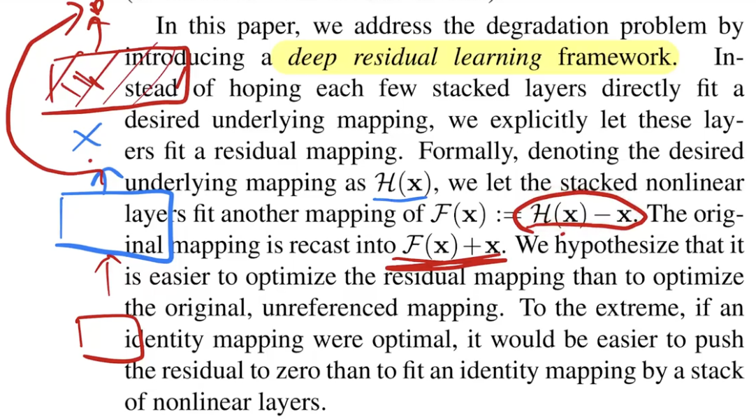 - 第三段,深入讲加了更多层之后精度变差这个现象。考虑一个浅一点的网络,再多加一些层进去,如果浅的网络效果不错,深的网络是不应该变差的。因为新加的那些层,可以把这些层学成 identity mapping,输入什么就输出什么。但实际上 SGD 找不到这个解。那该怎么办?