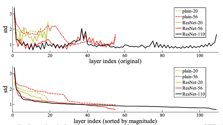 - CIFAR 图片 32x32,数据集相比 ImageNet 更简单:5万例,10 类。110层最好,1202层有一些过拟合,但也不严重。