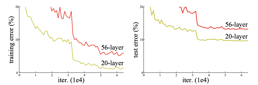 - 但是另外一个问题:当网络变深,性能其实是变差的。这不是因为层数变多,模型变复杂,导致的过拟合,因为训练误差也变高了(过拟合是训练误差低,但测试误差高)。所以更大的网络,虽然似乎是收敛的,但是没有训练到一个比较好的结果。