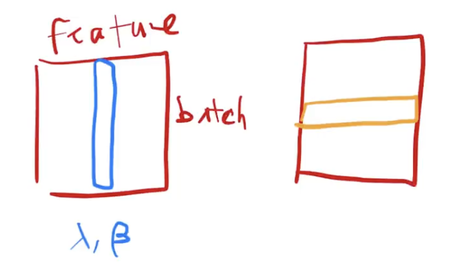 - batchnorm:对每个特征列,把它在一个 mini-batch 里的均值变成0,方差变成1(就是把向量本身的均值减掉,除以方差)。训练时,均值方差是在小批量里算的。预测时,算全局的均值,整个数据扫一遍,在所有数据上的均值方差存起来。bn还会学一个lamta,gama,可以把这个向量通过学习,放成任意方差,均值为某个值的东西。