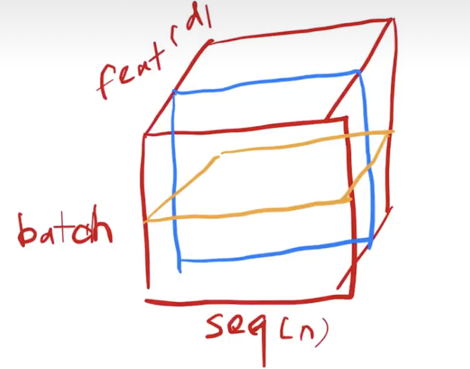 - batchnorm:按蓝线切,对特征列,切一个平面出来,理解为这种切法要保留完整的 batch 和 seq 维度。每次取一根特征,把这个二维 [BS, seq_len, 1] 的所有元素,变成均值0方差1。也可以理解为把二维拉成一个向量,和之前一样。