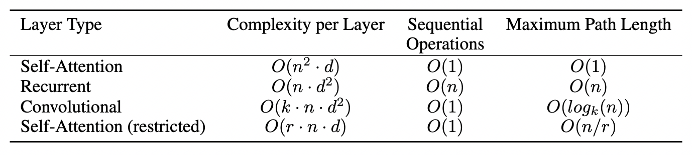 - 比较了四种不一样的层:自注意力,循环层,卷积层,受限的自注意力。