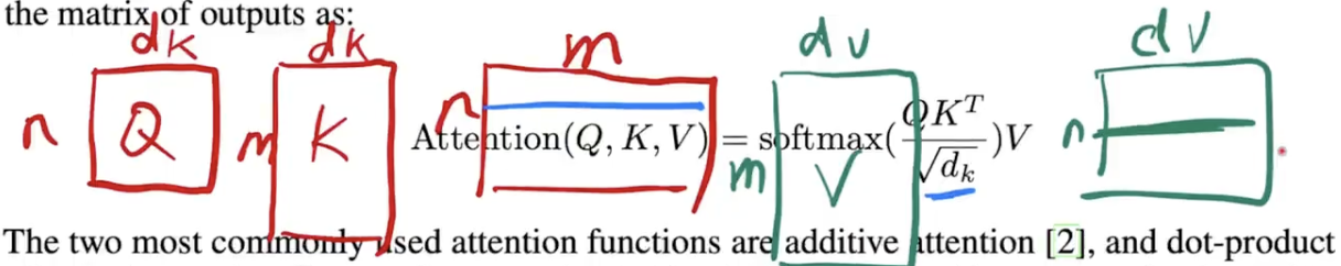 - 因为不同的相似函数导致不一样的注意力版本,Transformer 用的是最简单的注意力机制,里面的 query 和 key 长度是等长的,都是 d_k,value 是 d_v,因此输出也一样是 d_v。