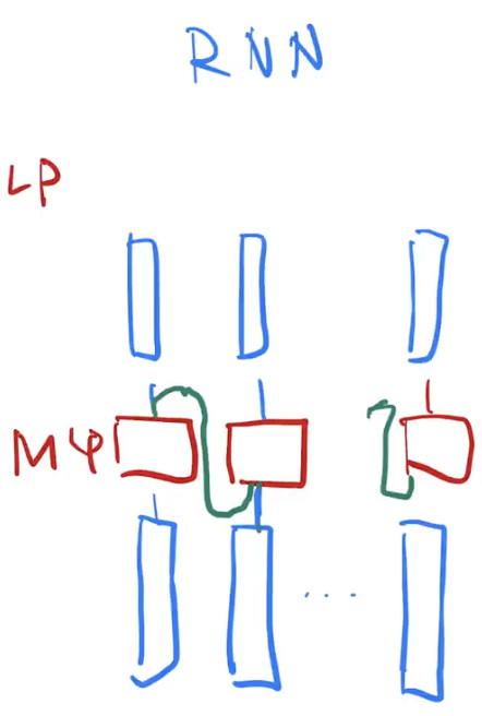 - 对比 RNN:输入一样是一些向量,对于第一个点,也是做一个线性层,做一个最简单的,没有隐藏层的 MLP,纯线性层。第一个点就是直接做,对于下一个点,怎样利用序列信息:还是用同样的 MLP,权重也和之前一样,但是时序信息是,把上一个时刻的输出放回来,和当前时刻的输入一起并进去,就完成了信息的传递,得到当前输出。